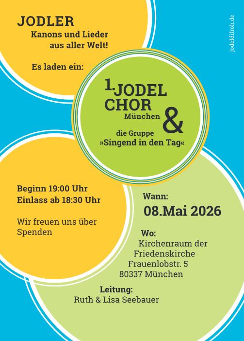 Einladung zusammen mit dem 1. Jodelchor München zum Werkstattkonzert am Fr, 8. Mai 2026 um 19 Uhr in der Friedenskirche, Frauenlobstr. 5 80337 München.
